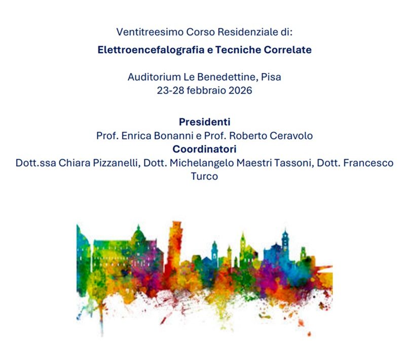La U.O.C. Neurologia Neurofisiopatologia, in collaborazione con la Società Italiana di Neurofisiologia Clinica (SINC), l’Associazione Italiana Tecnici di Neurofisiopatologia (AITN), l’Università di Pisa e l’Azienda Ospedaliero-Universitaria Pisana, promuove il ventitreesimo Corso Residenziale di “Elettroencefalografia e Tecniche Correlate”, allo scopo di fornire ai Medici, specialisti in discipline neurologiche e non, ed ai Tecnici di Neurofisiopatologia, una preparazione di base di tipo teorico-pratico e un aggiornamento continuo nella disciplina.